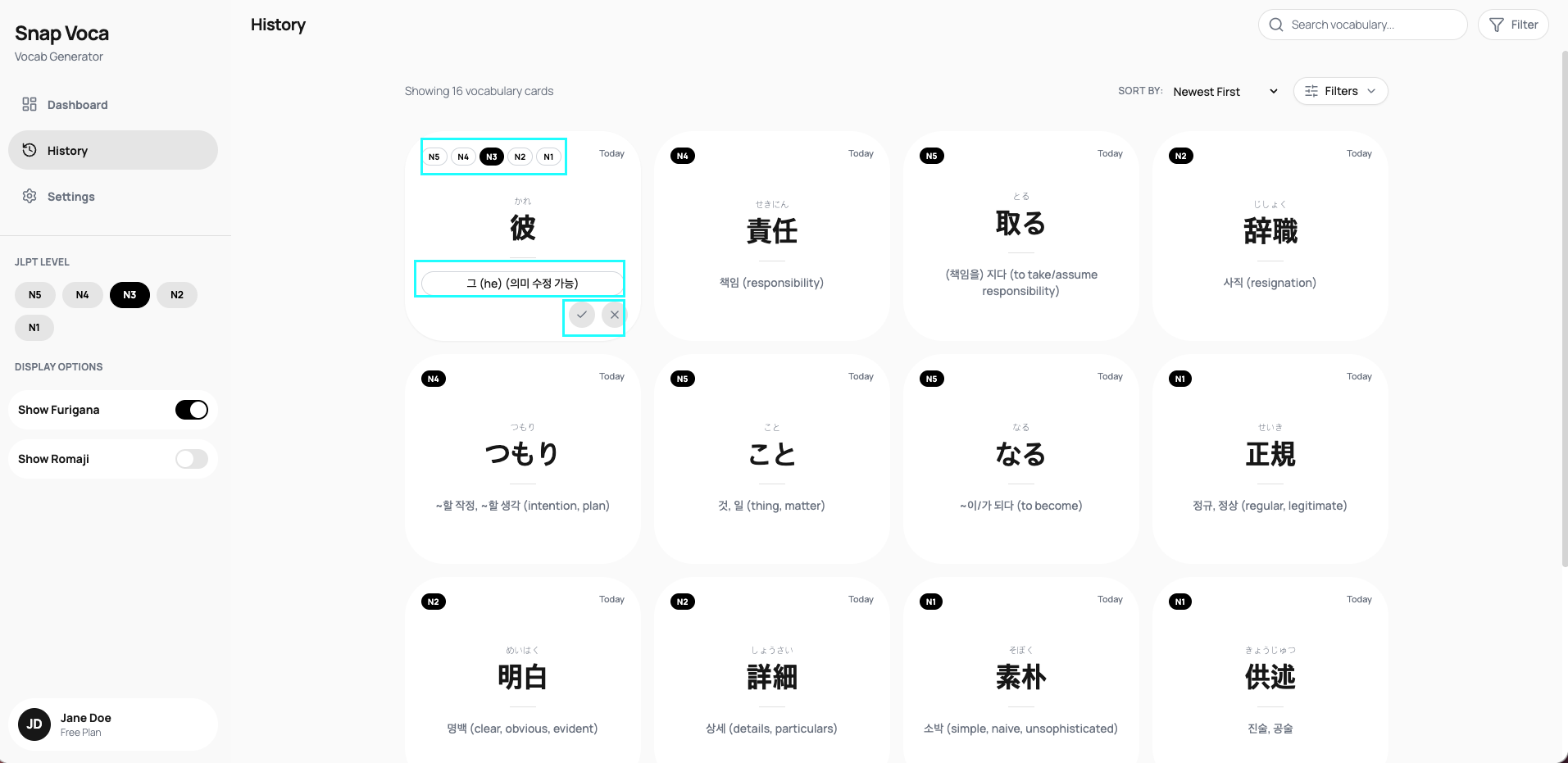 - 수정 버튼 클릭 시 뜻을 보여주는 부분은 Input이 보이게 수정 + JLPT 레벨은 버튼이 보이게 수정